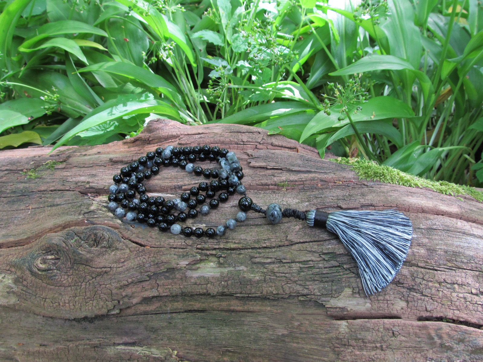 De Guru kraal is van zwarte Agaat, daarboven een mooie grote Labradoriet Edelsteen.