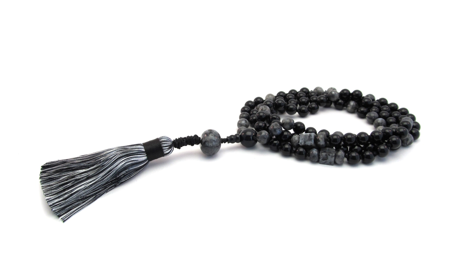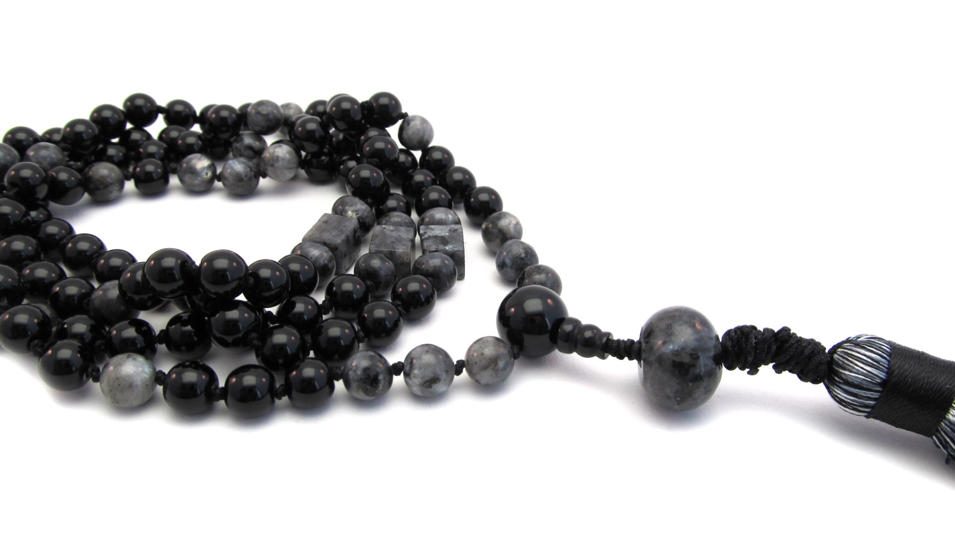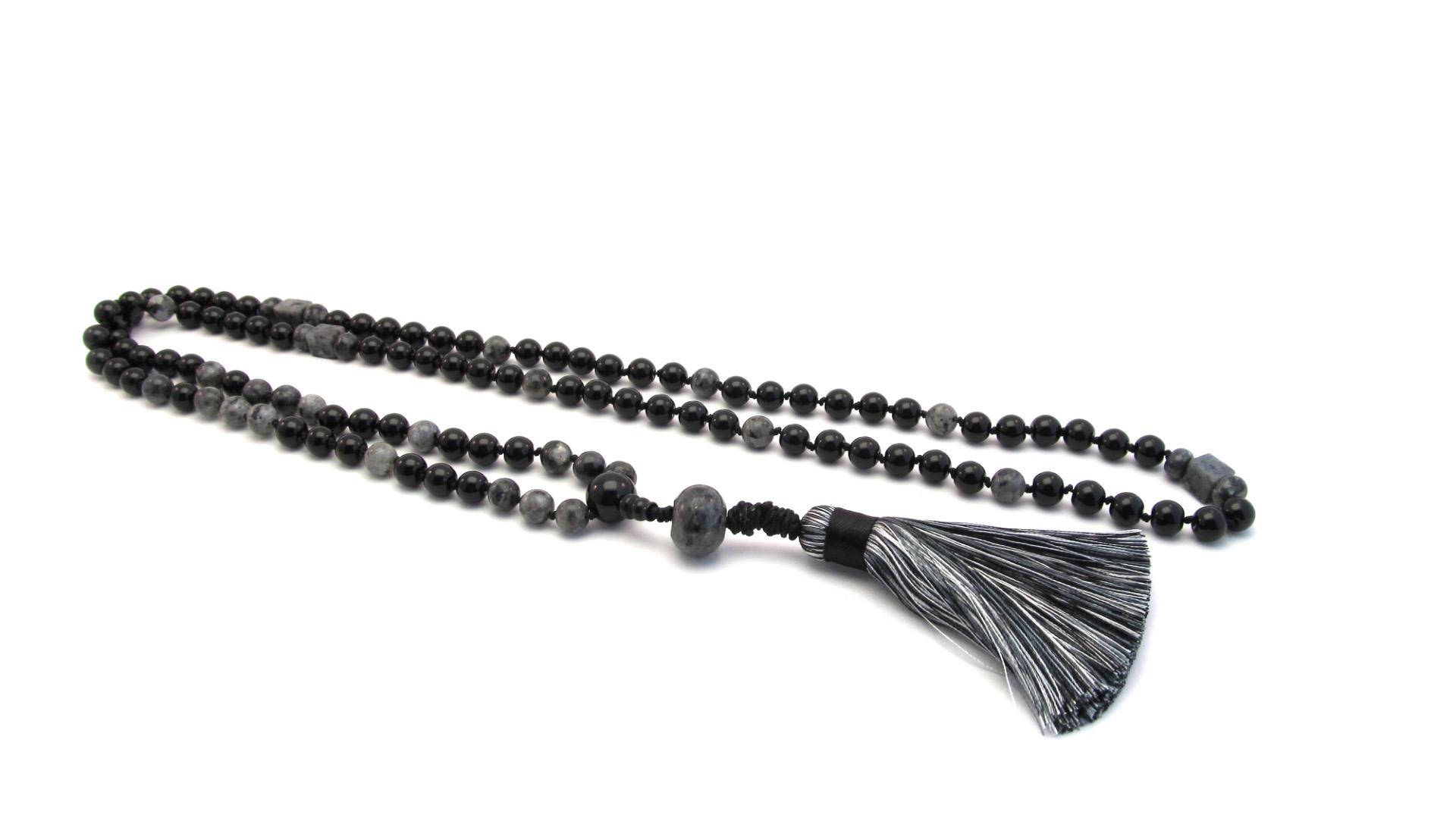 Mooie handgeknoopte Mala ketting op zwart satijn draad van Onyx Edelsteen.