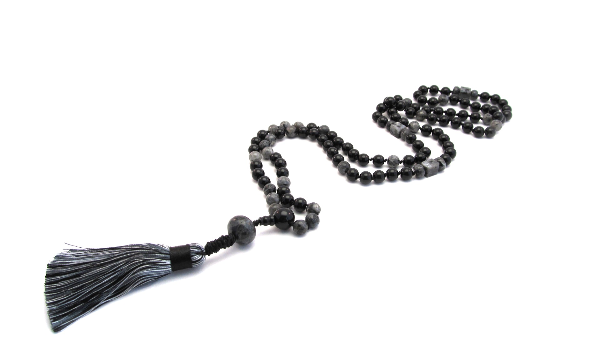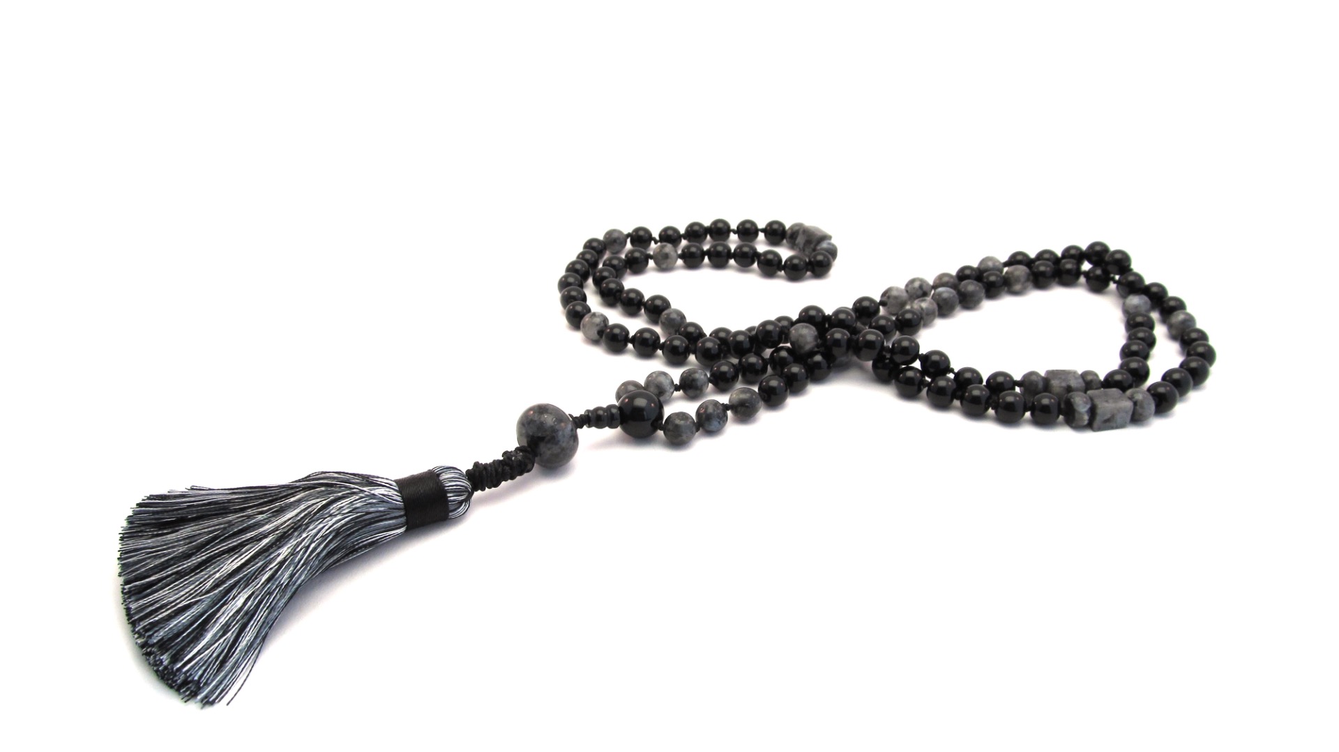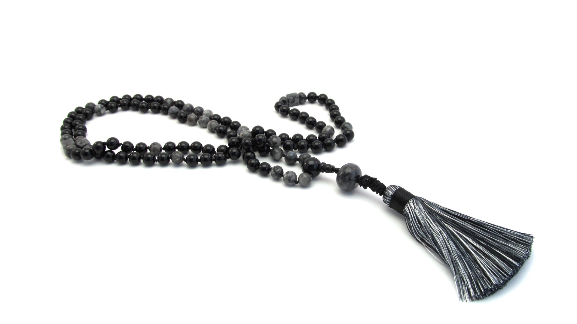 Mooie handgeknoopte Mala ketting op zwart satijn draad van Onyx Edelsteen.