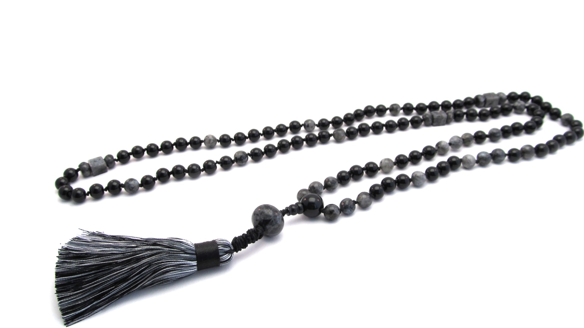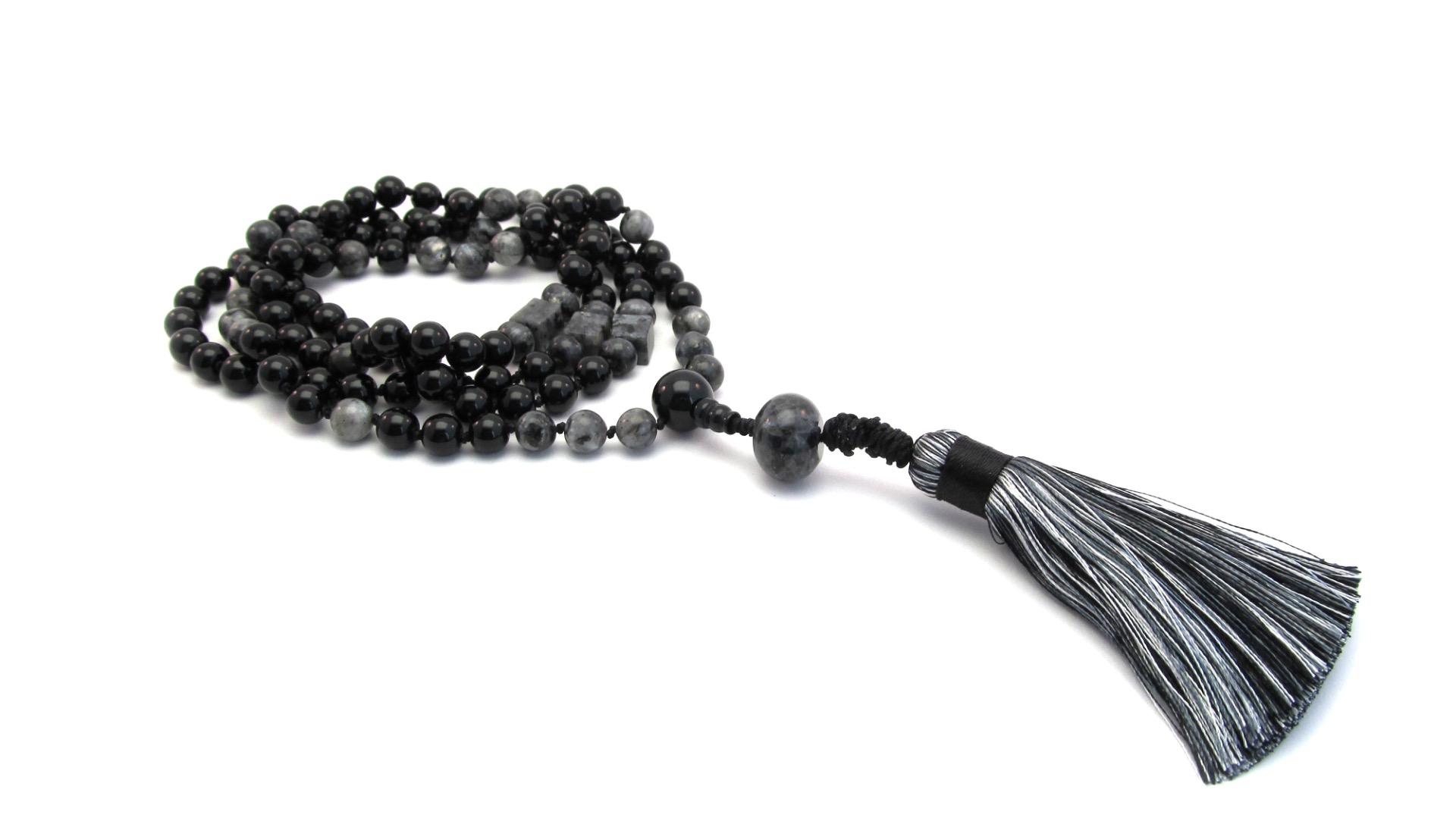 De mala heeft om de 27 kralen spacers van Labradoriet Edelsteen en heeft 108 kralen speciaal geschikt voor meditatie.
