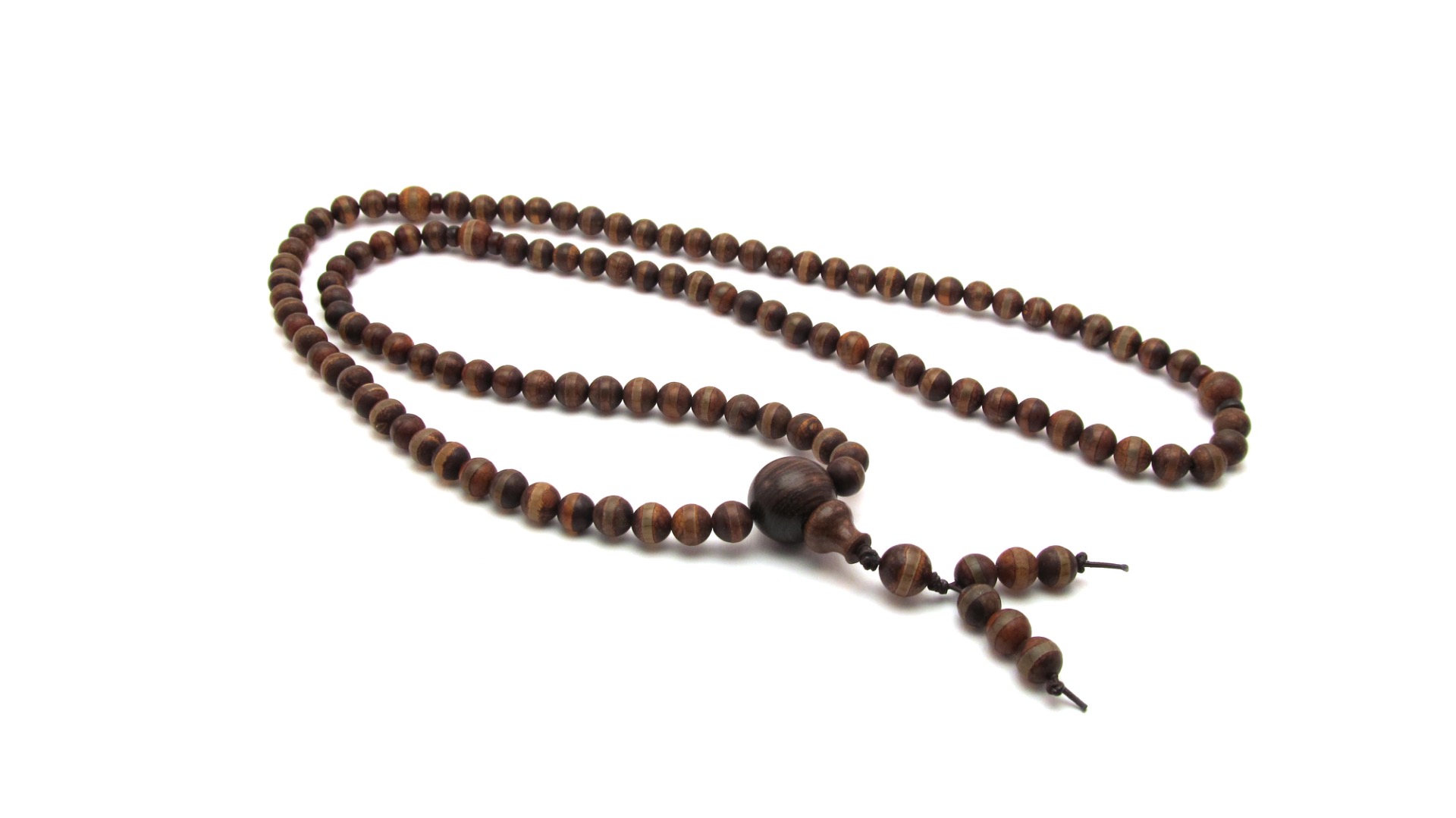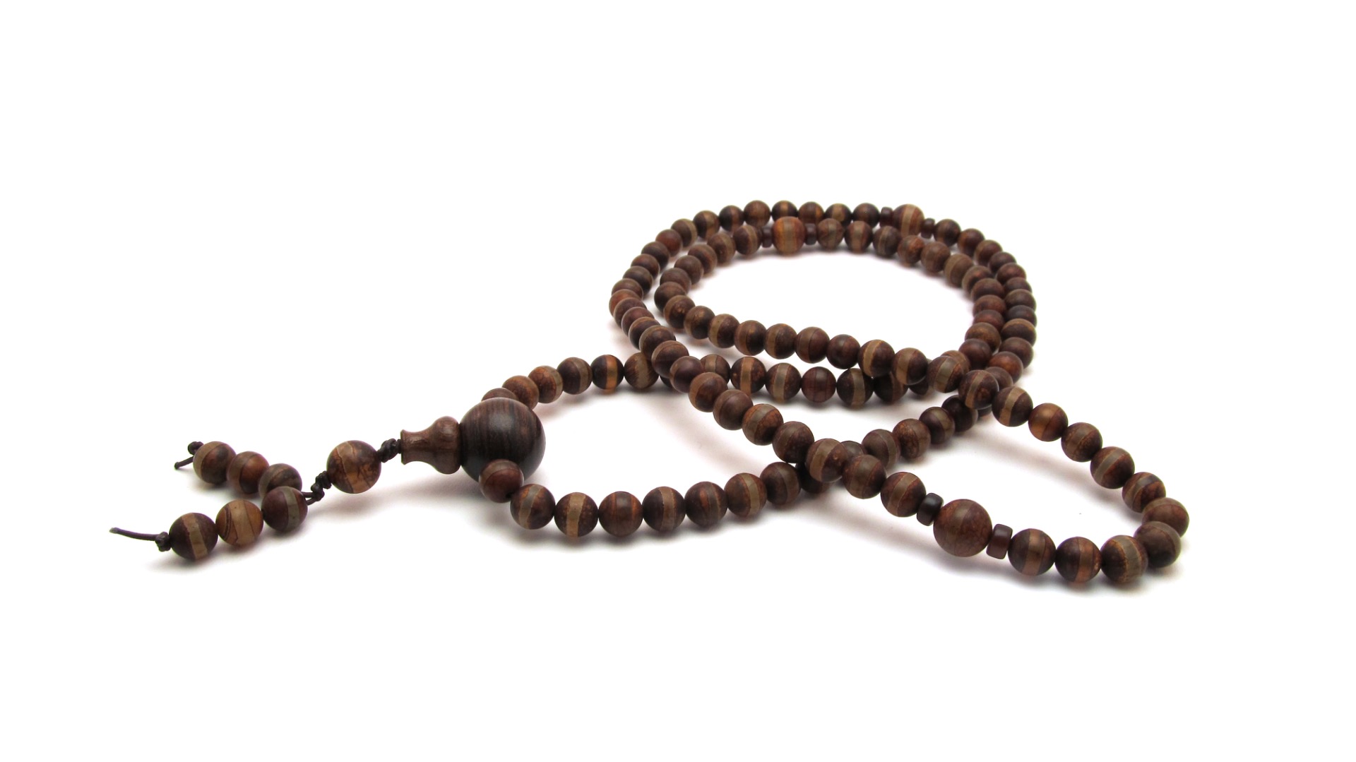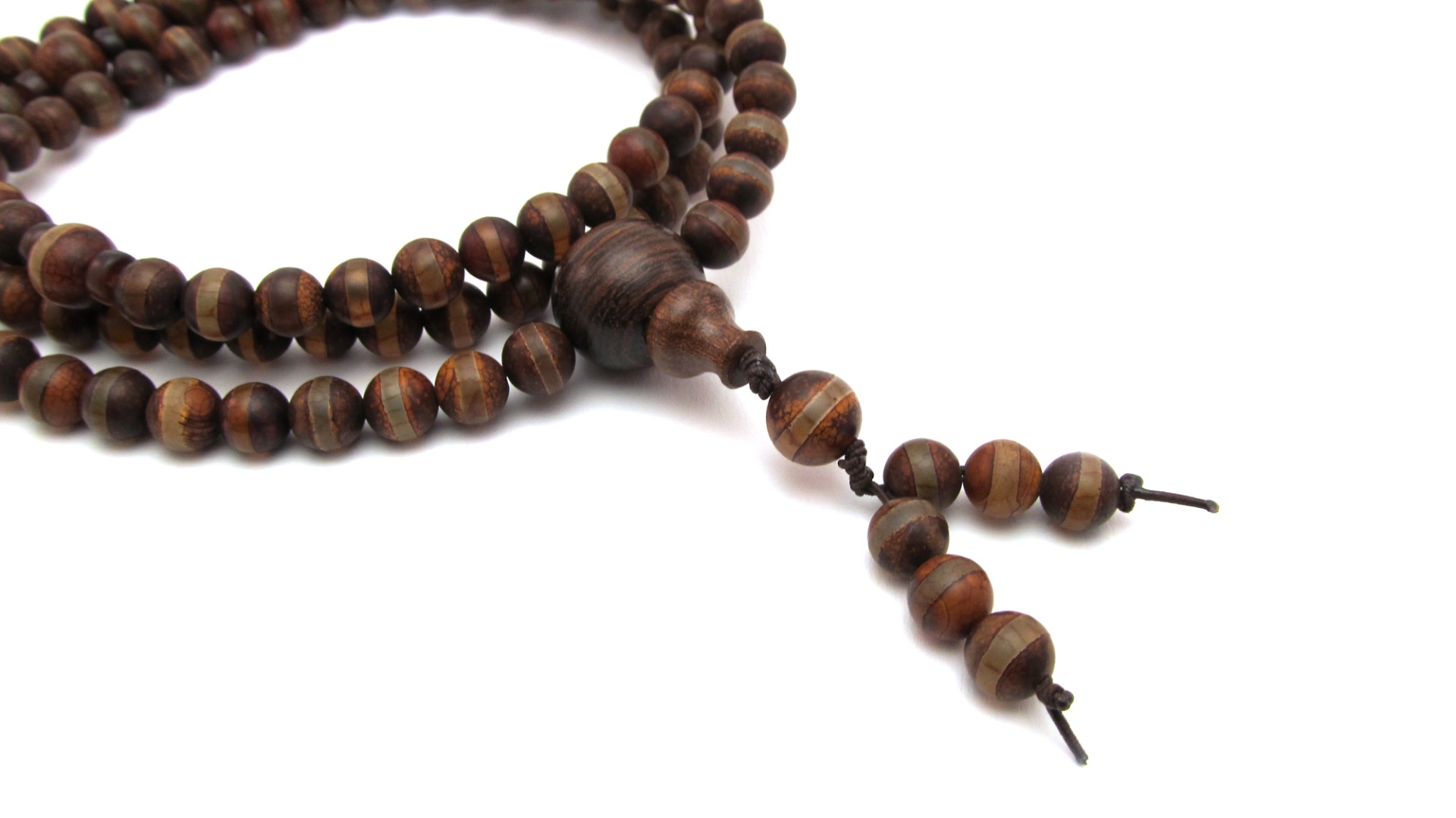 De Guru kraal is van Bruine tijger Sandelwood, daaronder ook Tibetaanse Dzi Edelsteen kralen.