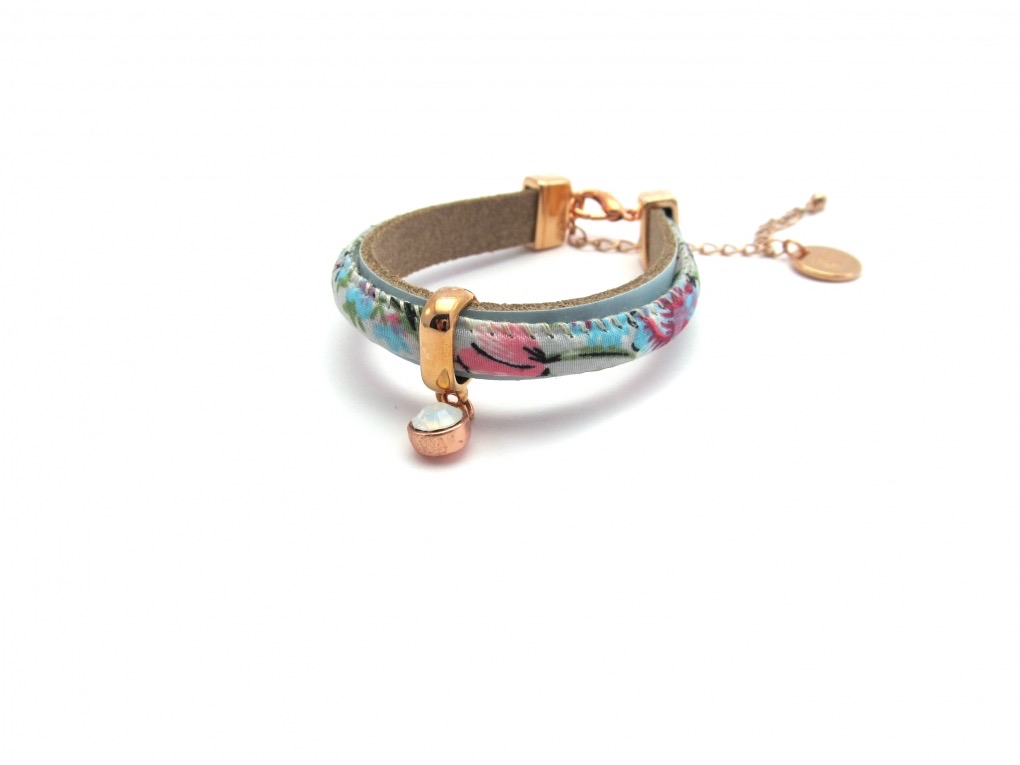 Zomerse armband met een pastel kleurige leren armband met eent koord van stof met leuke fleurige bloemen.