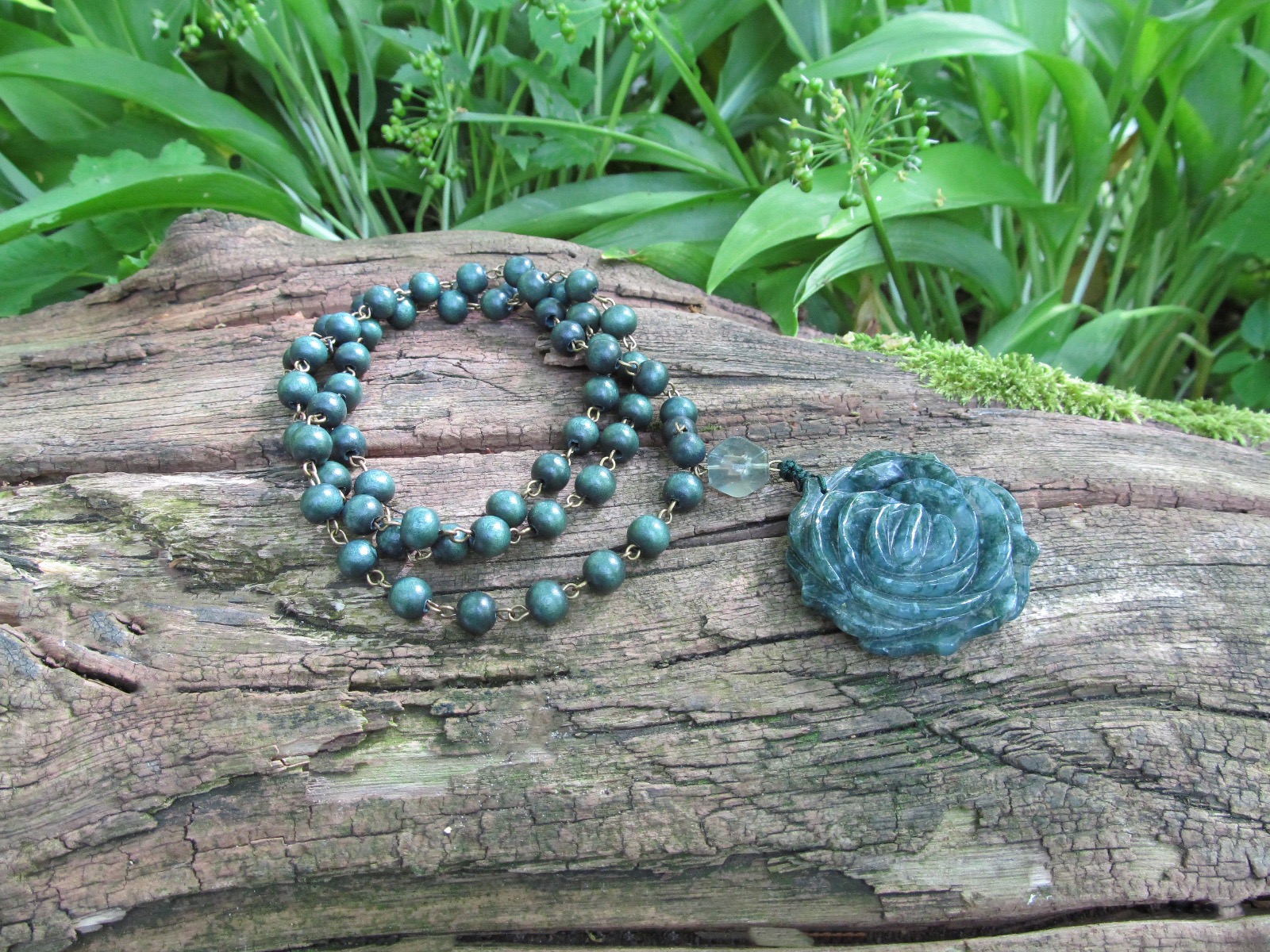 Handgemaakte donker groene houten ketting met bijzonder mooie Edelsteen hanger
