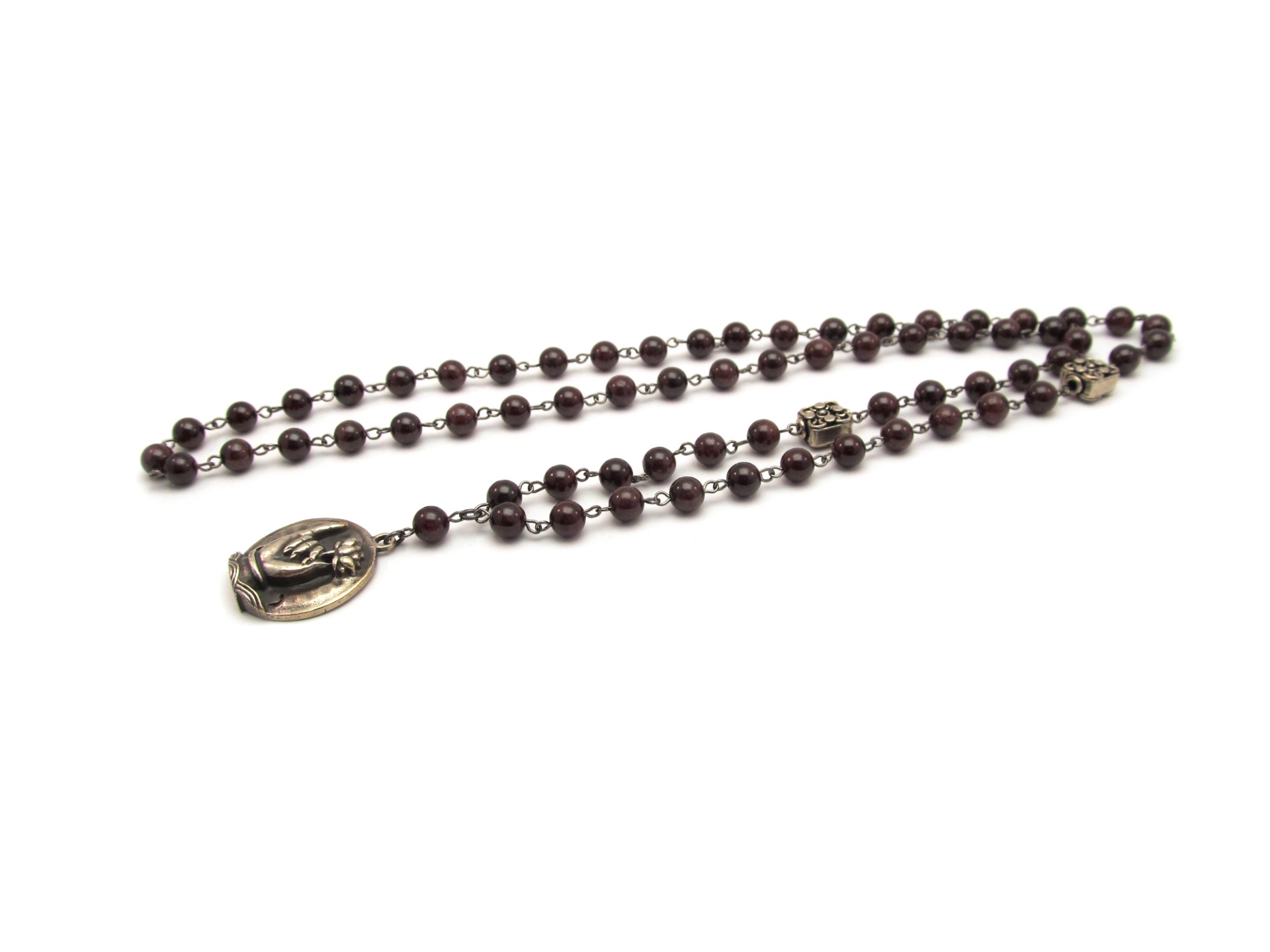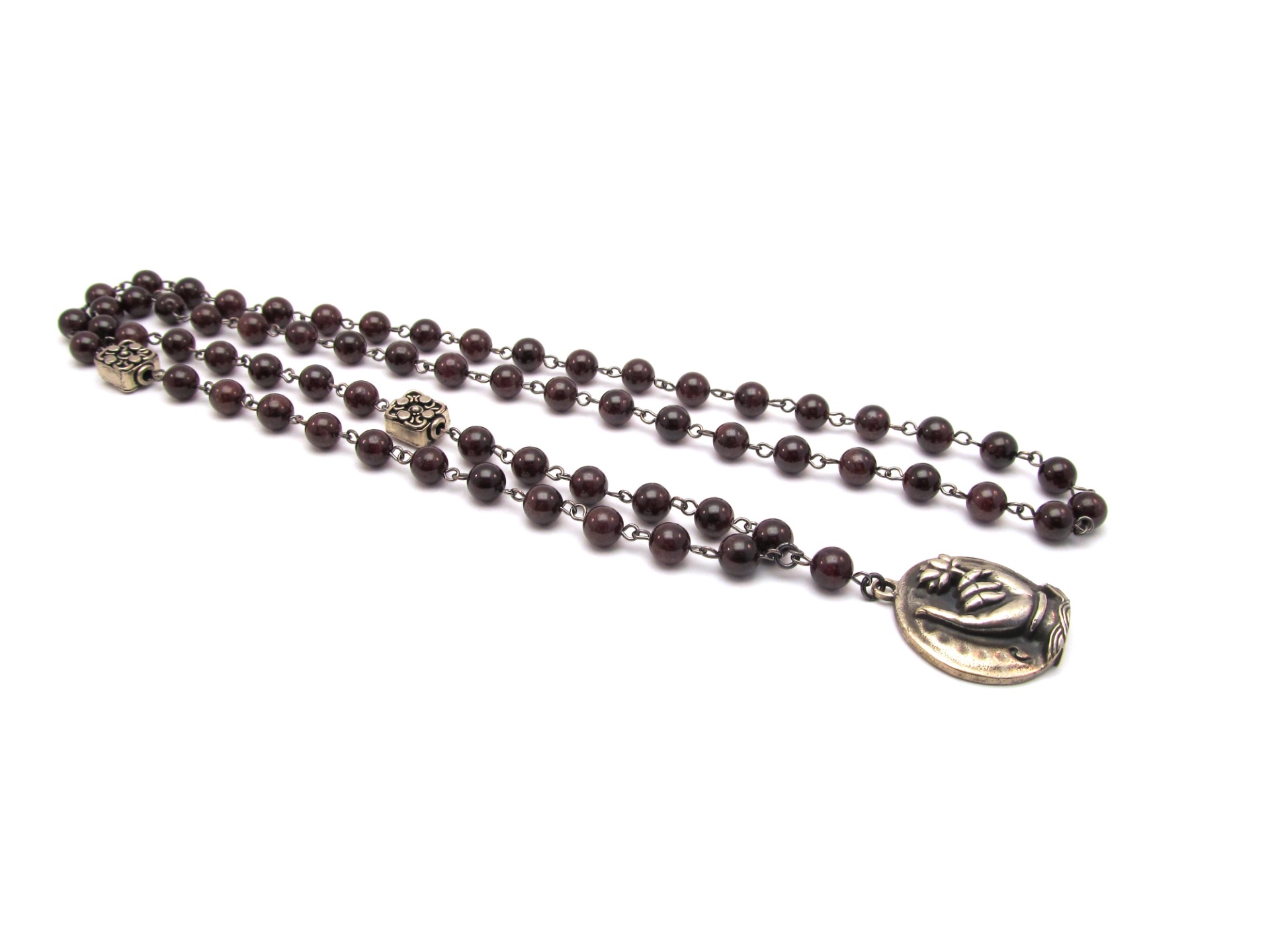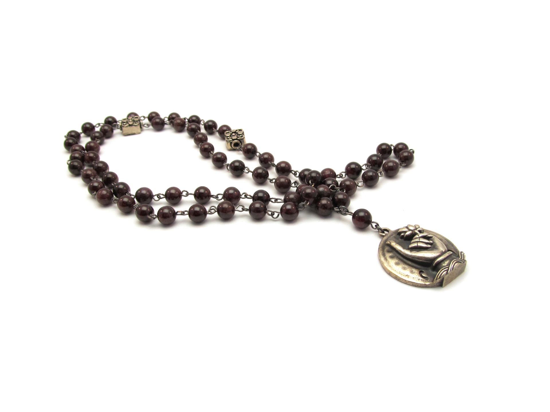 Tussen de granaat kralen mooie bewerkte zilverkleurige vierkanten metalen kralen met een bloem, de kraal is dubbelzijdig bewerkt. De Granaat kralen zijn mooi donkerrood en hebben een stoer uiterlijk met met als tegenhanger de medallion met mooie Lotus hand.