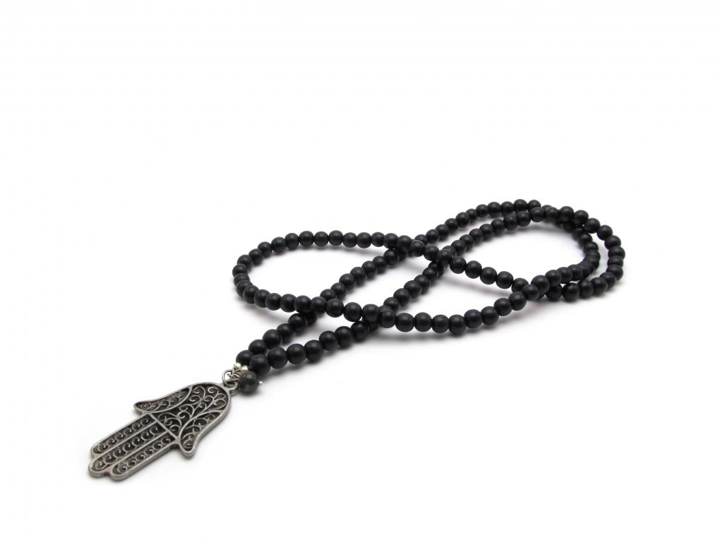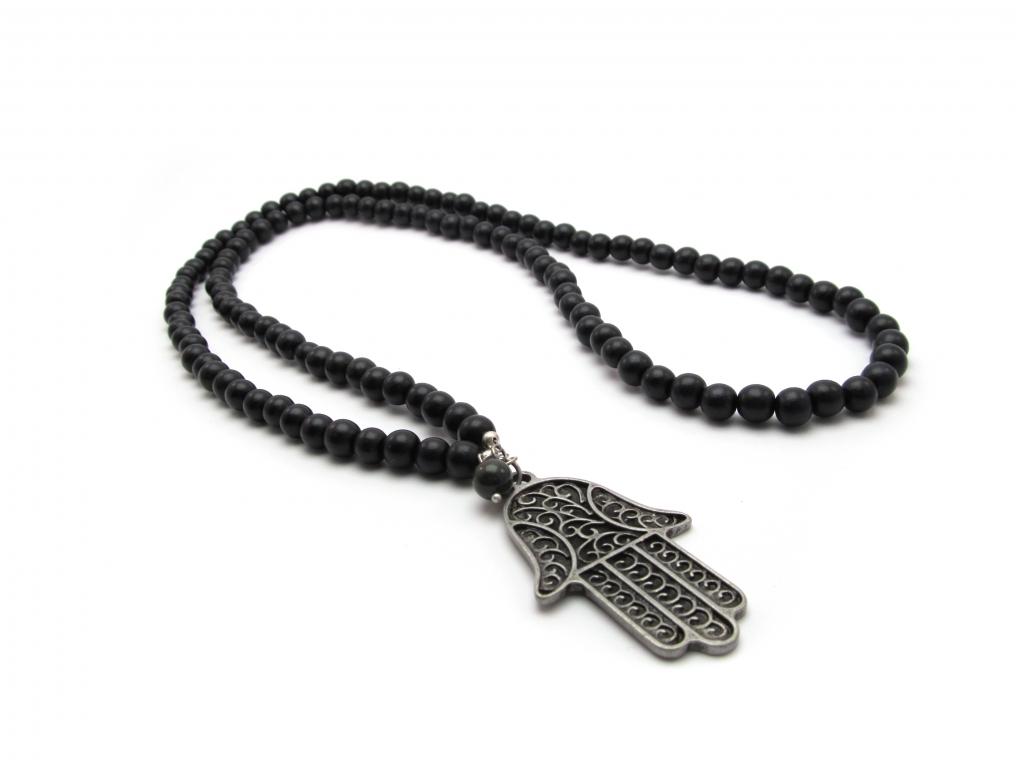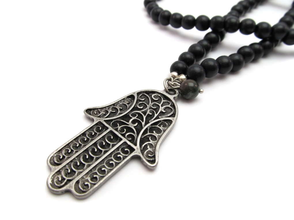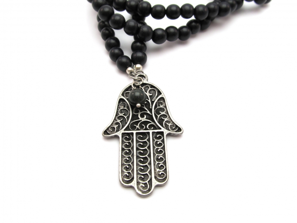 Lange handgemaakte ketting van vintage zwarte houten kralen met een grote Designers Quality antiek zilverkleurige Hamsa hand.