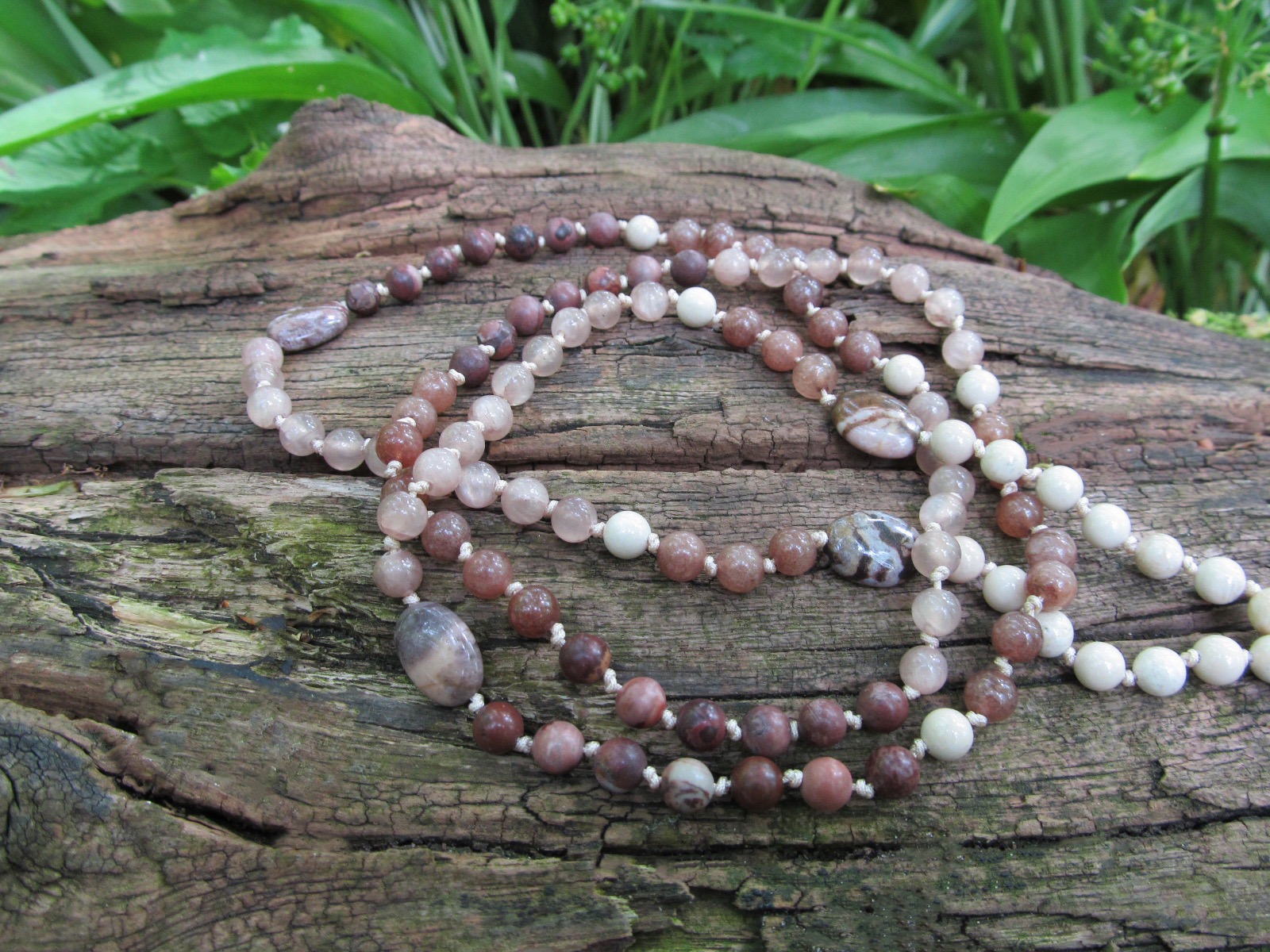 Voor deze Mala heb ik een combinatie gebruikt van Edelstenen, River stone en zachte, semi transparante zalm kleurige Agaat, cognac bruine Agaat en mooie leopard Jaspis kralen die prachtige kleuren hebben.