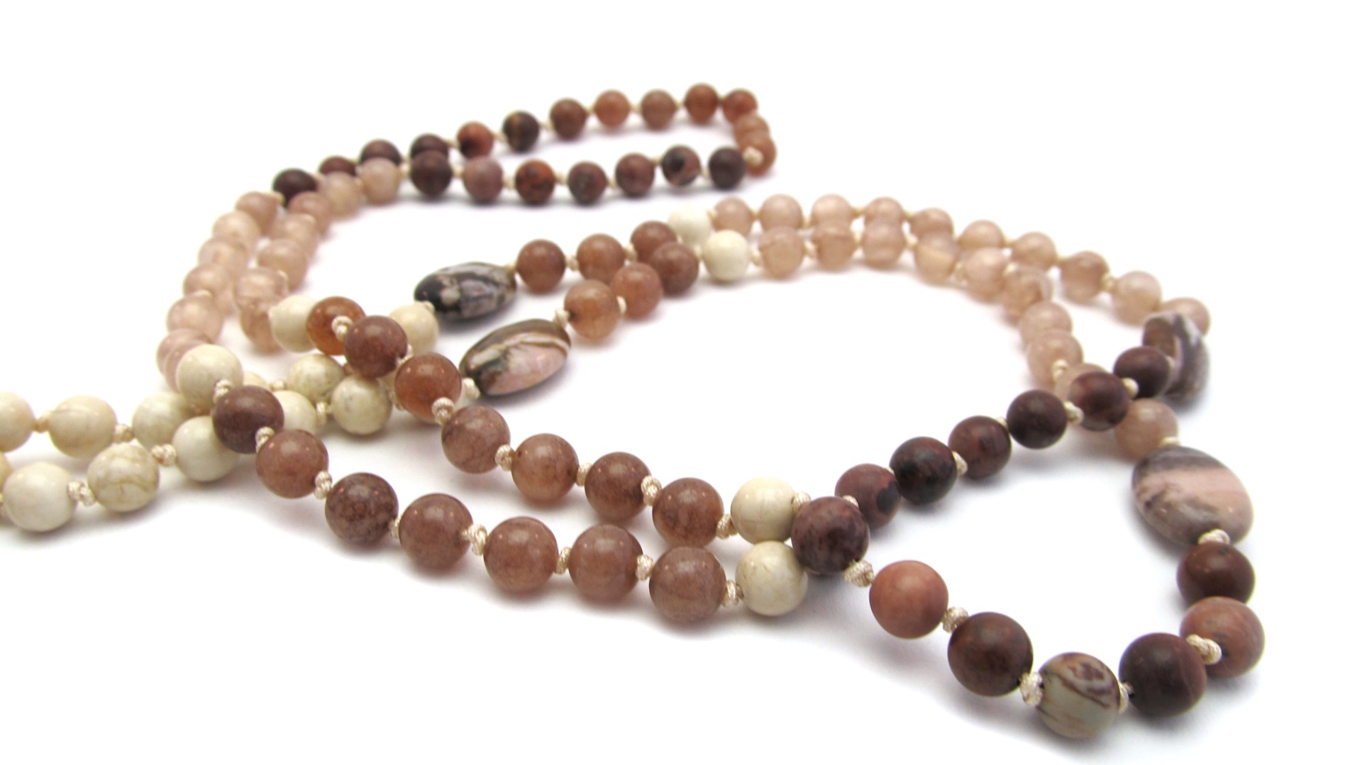 Mooie fijne handgeknoopte Mala ketting met Edelsteen kralen op creme kleurig satijn draad en bevat 108 kralen.