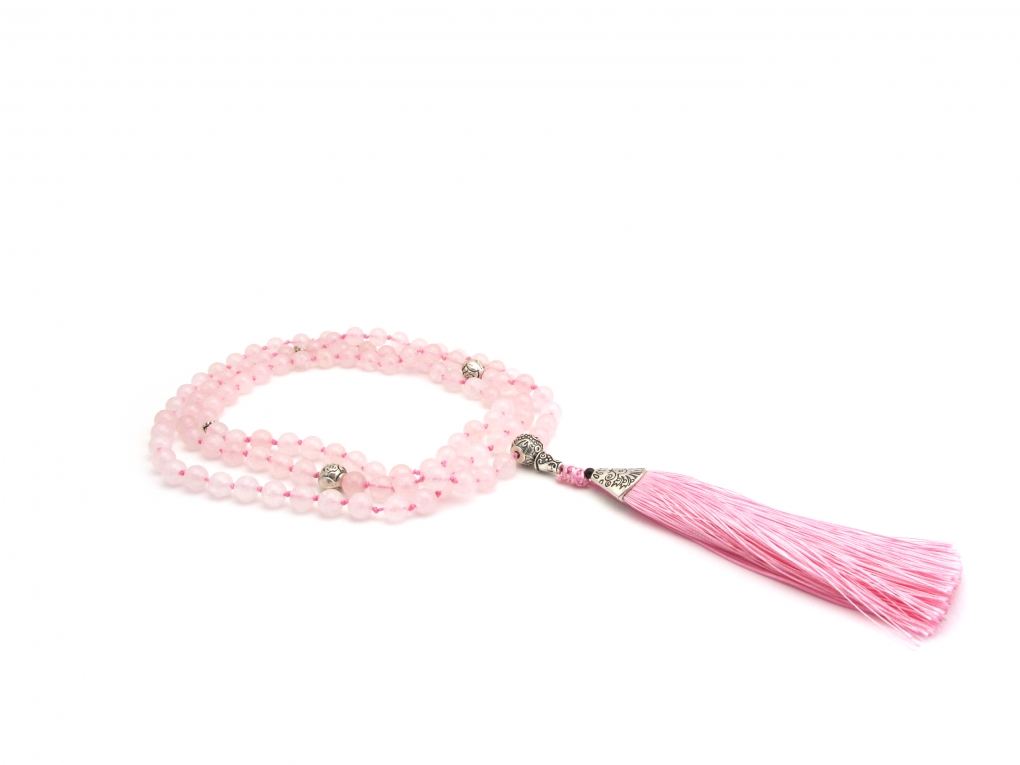 Handgemaakte Mala ketting van Rozen kwarts Edelsteen geknoopt op satijn draad en bevat 108 Rozen kwarts kralen en is afgesloten met een zilverkleurige metalen Guru bead.