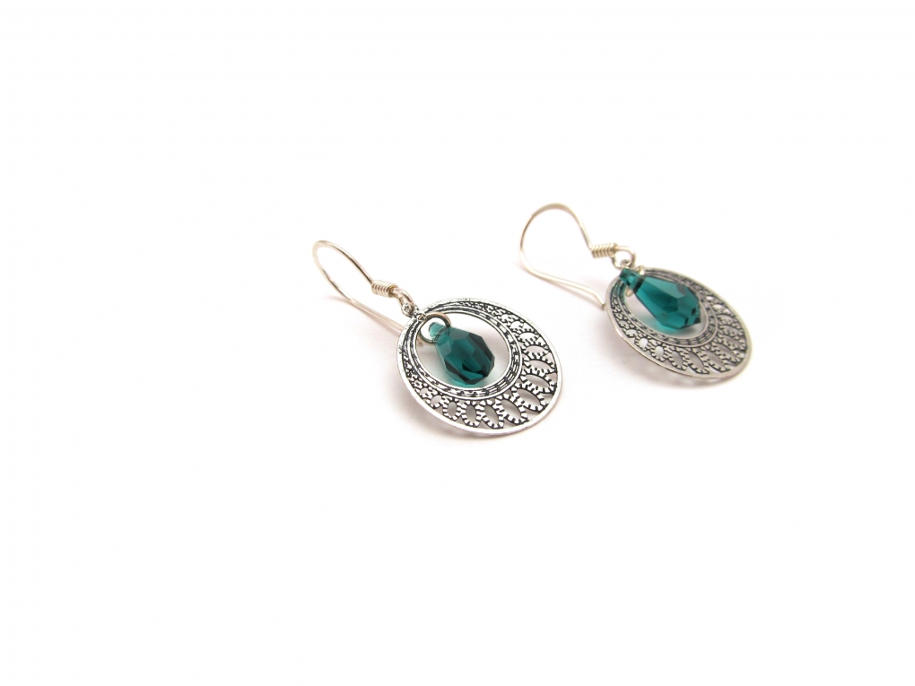 Een filigrain zilverkleurig metalen hangertje met een smaragd groene Swarovski® kristal.