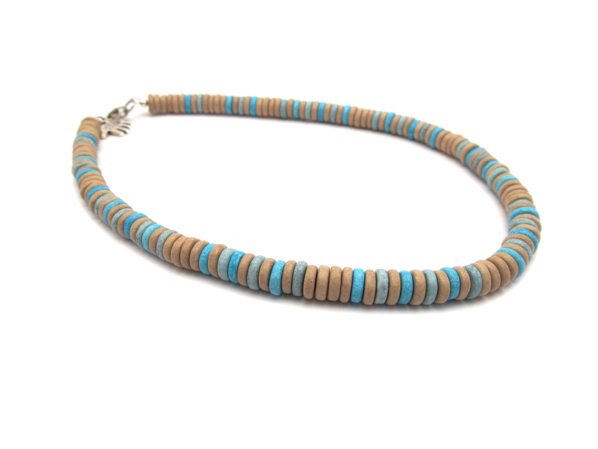 De kralen zijn gemeleerd van kleur in stone washed zand, turquoise en licht blauw.