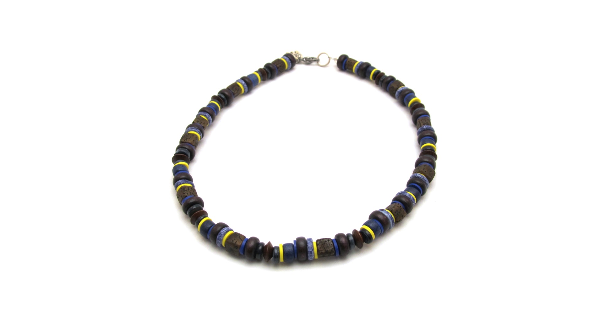 Voor deze ketting heb ik verschillende materialen gebruikt, vierkanten bruine houten Salweg kralen, blauwe en gele resin, bruine houten disc en ronde kralen, donkerblauwe schelp, donker en kobalt blauwe keramiek kralen.