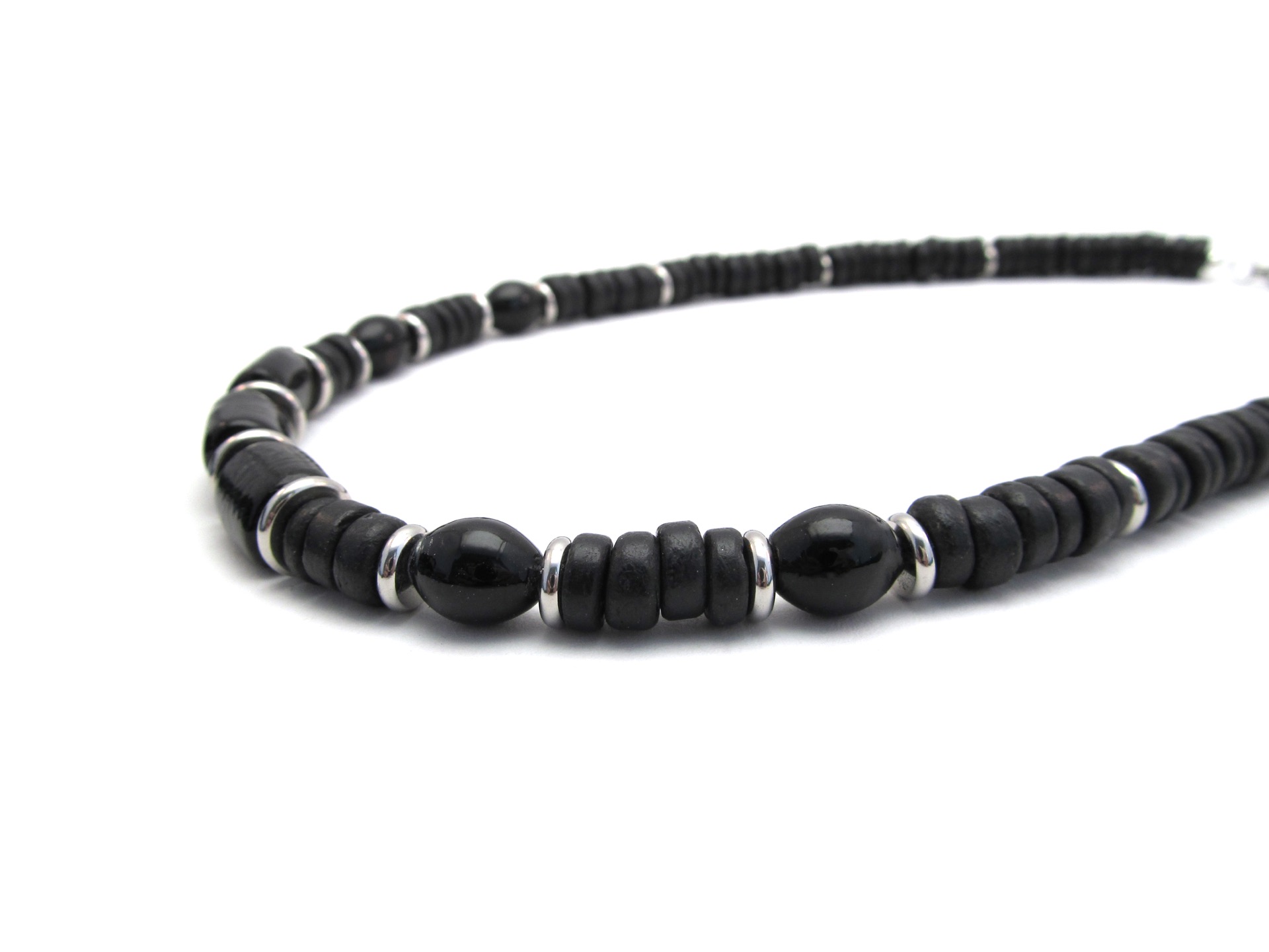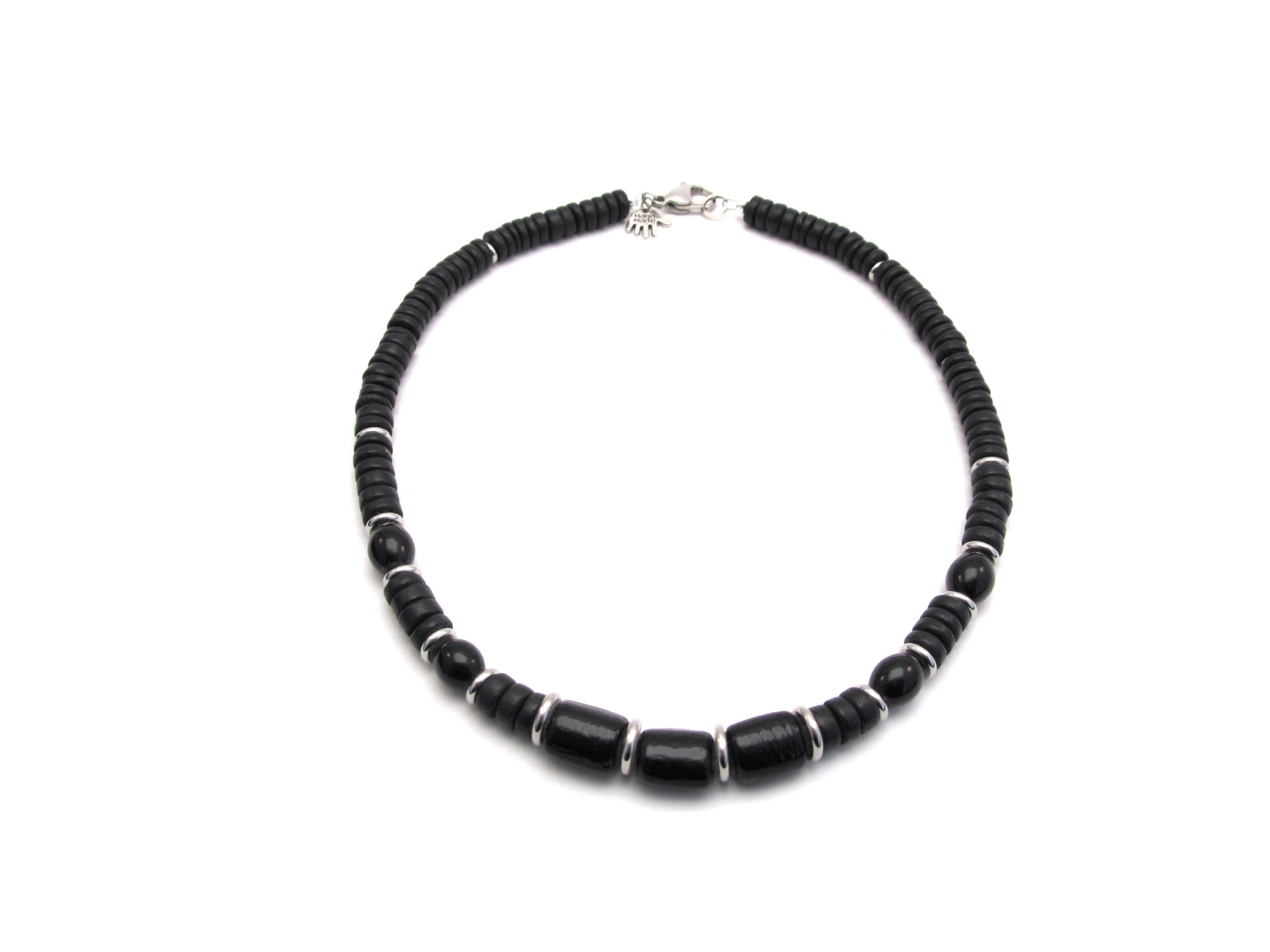 De ketting heeft zwarte cocos kralen met daartussen rvs disc kralen en verschillende vormen zwarte glaskralen.