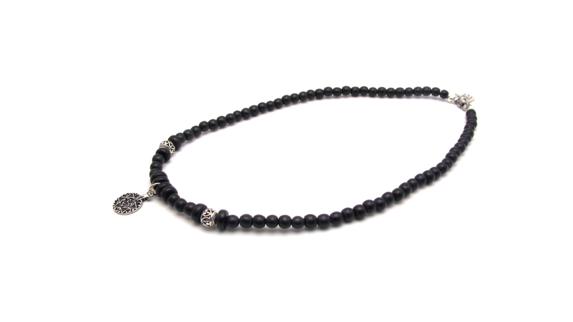 Ketting met zwarte houten kralen, de kralen hebben een vintage look, wat de ketting net wat stoerder maakt.