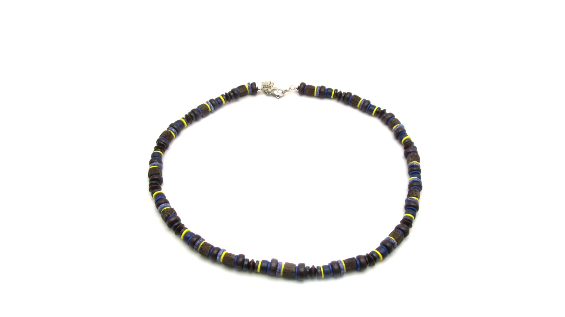 Voor deze ketting heb ik verschillende materialen gebruikt, vierkanten bruine houten Salweg kralen, blauwe en gele resin, bruine houten disc en ronde kralen, donkerblauwe schelp, donker en kobalt blauwe keramiek kralen.